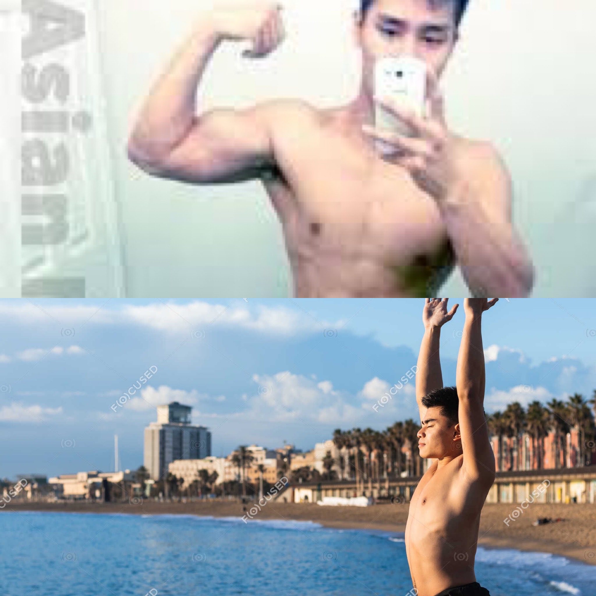 The female gaze would take that same man down to the beach during the golden hour of sunset and he strikes a shirtless yoga pose on the beach. He’s still shirtless and showing off his muscles, but the picture is taken as a WHOLE and not just separate body parts like a man would notice (i.e. abs and biceps). The shirtless Asian yoga mystic is striking a glistening pose with his taught muscles overlooking the crashing waves of the beach under the beautiful sunset.